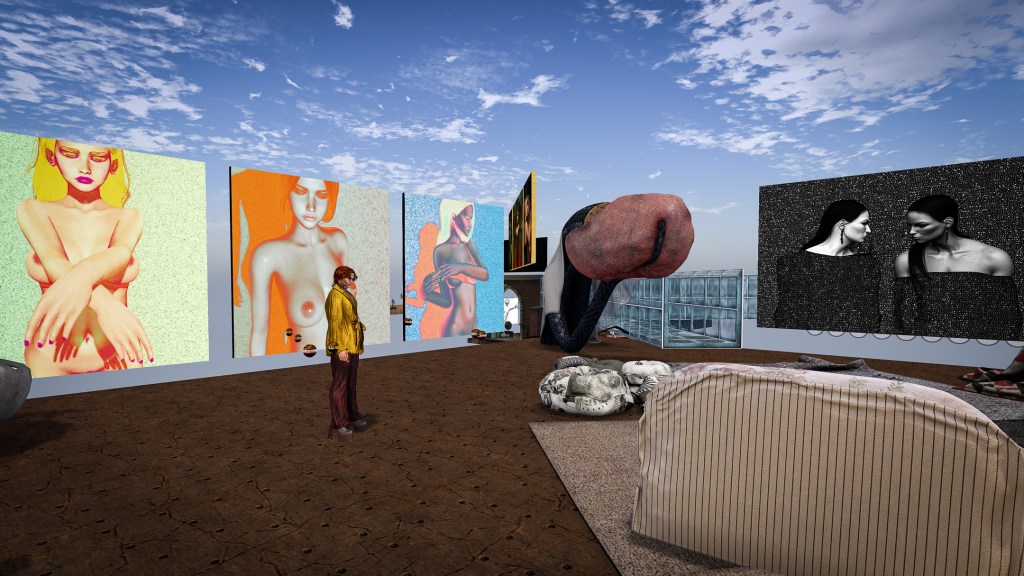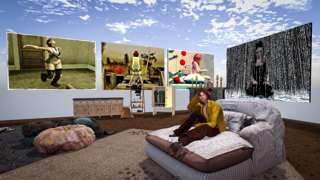 Megan Prumier’s works “Priestess of Equilibrity,” “Worshipper of The Sun,” and “Daughter of Nubia” along with deborakaz’ “if(self != self) duplicate() – deborakaz” installed in my skybox.Karma Weyman’s works “A Good Time For A Song,” “Wishful Thinking,” and “Down Time 3” along with deborakaz’ “class Human(Exception) pass- deborakaz” installed in my skybox. In Adwehe’s gallery she had two pieces in a corner together and I loved that configuration so much I asked if I could purchase it. Here in a corner of my little platform are her pieces “Tesselated canvas,” and “Inherent Light.”On the skybridge over to my platform I placed three of Obscuro Valkyrie’s portraits of his sim patrons, “Ink and Sukk,” “Halloween 25 Fieri,” and “Sue Mowadeng.”